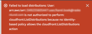 Failed to load distributions: User: arn:aws:iam:::user/ is not authorized to perform: cloudfront:ListDistributions because no identity-based policy allows the cloudfront:ListDistributions action