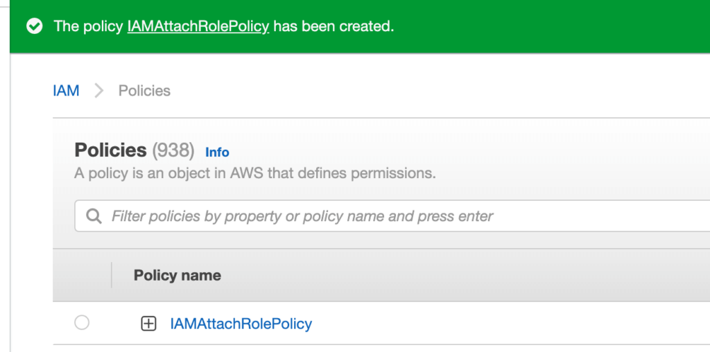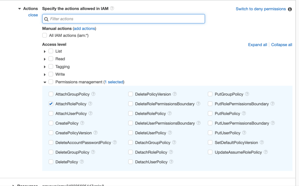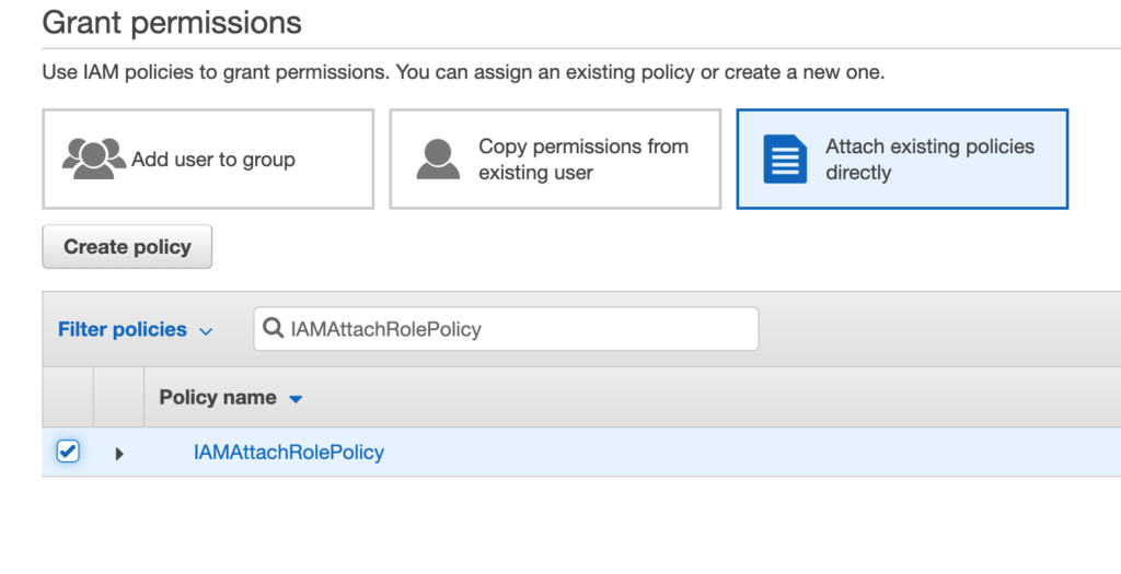 - Click next to attach IAMAttachRolePolicy policy to the user.