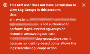 This IAM user does not have permission to view Log Groups in this account.User: arn:aws:iam::…..:user/….. is not authorized to perform: logs:DescribeLogGroups on resource: arn:aws:logs:us-east-1……log-group::log-stream: because no identity-based policy allows the logs:DescribeLogGroups action